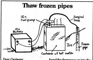 The pump forces water from the container through the surgical hose down into the frozen pipe. The deeper you go into the pipe, the slower the thawing process, Nelson says, adding that the process is fast and uses little water - 1 1/2 gal. does about 4 ft. of ice.