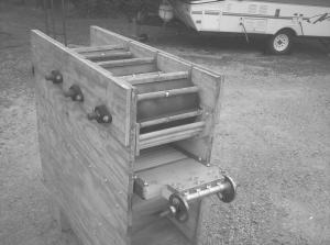 The first machine threshed about two bushels/hour and Hillis hopes to improve on that. Instead of running it off a pto, the new machine can run off a 5 hp gas engine. He also upgraded the wood stove fan from his first machine with a paddle fan, similar to those on old combines. The new machine has three cylinders instead of two and a straw walker that moves the straw out with a screen below for grain to drop through into a container. The thresher will be mounted on wheels.