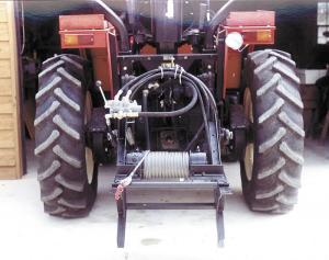 He bought a used hydraulic-operated winch and bolted it onto a commercial steel frame that mounts on a tractor 3-pt. hitch. The winch has its own hydraulic motor and valve bank with control lever.