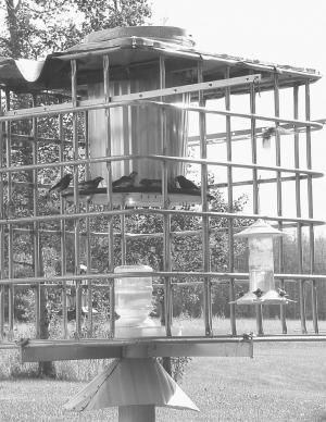 The feeder holds three 5-gal. pails of birdseed at a time. It consists of a steel cage with a metal top mounted to a 4 1/2-ft. tall steel pipe with a modified garbage can to hold the seed. The can sits in a hole in the top of the cage. Holes in the base of the can empty out to a feeding tray. Stubbs made the tray by attaching a lid from a 5-gal. pail to the bottom of the garbage can. The cage keeps deer and other critters away from the seed, while the height makes it easy to work under.