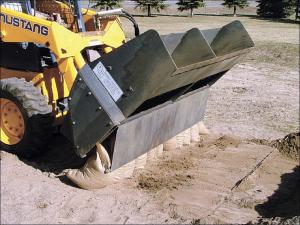 The Pro Bagger is basically a large scoop with 12 sets of bag holders on back. Workers clip 12 poly or burlap bags in place. The operator activates a hydraulic cylinder to lock them in place so they'll hold up to 100 lbs. each. The operator then scoops up the sand, gravel or dirt, lifts the scoop, hits a lever and drops the 12 bags ready to be used.