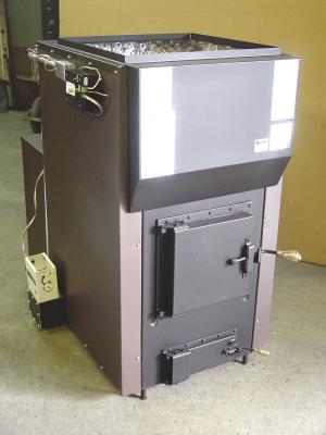 The Kuuma Vapor-Fire 100 combustion chamber is only 23 in. long by 15 1/2 in. wide by 20 in high. The fire door is 12 in. by 12 in. and takes a maximum wood length of 22 in. Even with that limited size, Lamppa says that when set on medium burn, a single hardwood fill will last for 10 to 12 hours. Hardwood coals will last another 6 to 12 hours. When reloading the chamber, coals are simply pulled forward before fresh wood is added. Once the door is shut, the logs quickly ignite and burn at the preset rate.