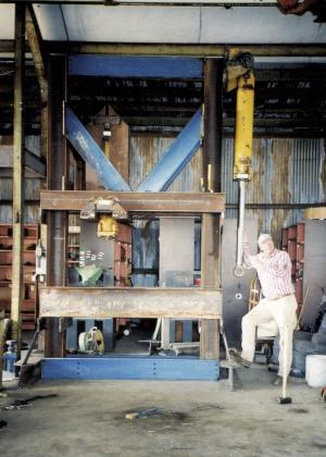 Pete Captein, Ontario, Ore.: "I was never able to justify the cost of a big shop press so I built my own. It's about 14 ft. high, 10 ft. wide and is made from 10-in. H-beams. It sets on a 6-ft. wide base. The 8-in. dia. cylinder is off an old Michigan payloader and is made so I can roll back and forth on the table, anywhere I want. It can handle very big jobs.