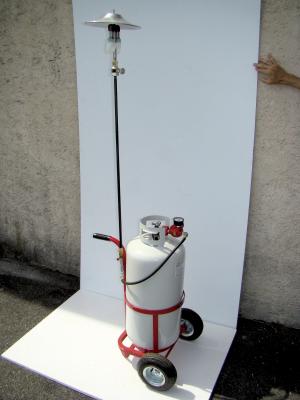 The pole for the light can be mounted on the bottle or the handle, King says. Also, a heater head can be placed on the bottle and moved around with the cart.