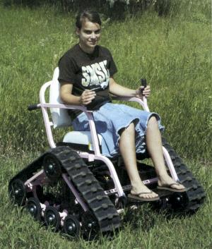 That's the idea behind this new off-road wheelchair that mounts on 6 1/2-in. wide rubber tracks. Inventor Tim Swenson says his "Action Trackchair" lets you go places where conventional wheelchairs won't go. It operates on two 12-volt wheelchair batteries and a 24-volt DC motor, which provides a range of up to 10 miles.