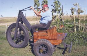 The trike has a tongue from a Deere grain drill so he can pull a chore wagon around the yard, but Melcher admits he built it mostly for fun.