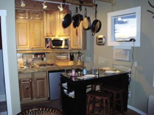 Half of the first floor is a living room with a couch, chairs and a square 2 by 2-ft. wood stove that keeps the house warm in the winter (two portable oil-filled radiator heaters provide heat when the stove isn’t lit). The other half of the main floor is split between a kitchen and a bath with shower. The kitchen has hickory cabinets, an electric cooktop, a microwave oven and an under-counter refrigerator.