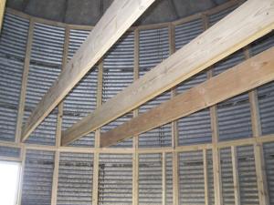 By doing some calculations, he figured he could build 2 by 8-ft. boxes out of 2 by 4’s and create almost a perfect circle of studs around the 56-ft. circumference of the bin. After building the boxes and fastening them together inside the bin, he built another set of boxes, only 7 ft. high, to create the walls for the second story, and then tied the upper and lower stud walls together.