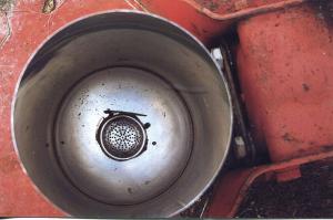 The tines scratched up the surface, spread out any trash, and thinned out the tufts of grass. To spread the seed, Chambers took advantage of an existing hole just behind the gearbox on the deck of the mower. He strapped a 7-in. diameter, 12-in. tall metal container over the hole. A sieve at the bottom of the container drops seed under the deck.