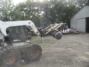 Reilly notes that disking behind his compact tractor had little impact on wheel tracks. Pushing the disk ahead of the skid steer eliminated that problem.