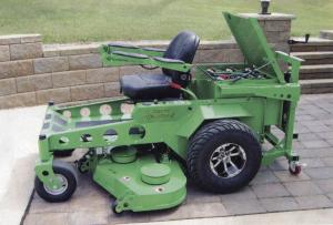 That’s because it has an innovative deep-cycle battery pack that can be quickly swapped out with a fresh battery pack. The 6 lead-acid batteries in each pack provide an average 90 to 120 min. of mowing time, enough to mow 3 to 4 acres. Once they wear down it takes less than 5 min. to swap in a fresh battery pack. The tractor has a 62-in. floating deck with four blades, each direct-driven by an electric motor. Top mower speed is 9.3 mph.