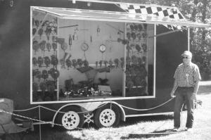 The trailer contains about 80 different hand-cranked bench grinders built from the late 1800’s up to the 1950’s, some of them quite rare. The grinders are designed to bolt onto a bench and were used to sharpen everything from kitchen knives to shop tools. Some models were designed to sharpen scythes and hand sickles. A few industrial models were designed for use in factories.