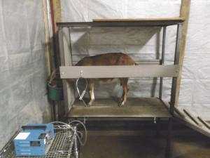 The hospital grade breast pump in Jim’s barn sits on a wire cart next to a milking stand built from angle iron and recycled plastic decking material. A length of plastic tubing is attached to the pump; the tube runs into the lid of a milk jar resting in a rubber bucket attached to the corner of the cart. Another length of plastic tubing runs from the jar lid to an open 35 mm plastic syringe. The syringe is hooked to the goat’s teat and when the pump is turned on, milk is sucked into the jar.