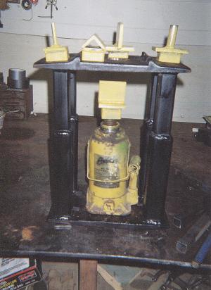 “It’s built strong and works great with standard 10 to 20-ton hydraulic jacks. It weighs only about 20 lbs. so I can easily lift it in back of my pickup if I need to take it somewhere. Works great for punching shafts out of sprockets and gears, for punching out holes in metal, and for bending iron. However, if I built another one I’d use telescoping legs that could be adjusted up or down to make room for longer shafts.”