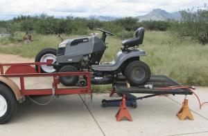 “I back up the mower until it’s midway between the ramp and trailer, lock the mower’s rear wheels with some wood blocks, and remove the hinge pin by rolling a hydraulic jack under the hinge point. Then I slowly pull the trailer forward until the mower is suspended between the trailer and ramp, with the front wheels on the trailer and the rear wheels on the ramp.”