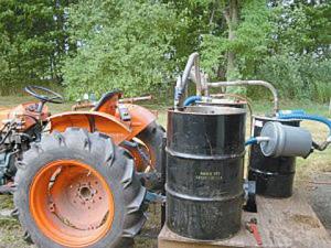 The device is fed as Dolan pours 2 medium-size pails of grass pellets into the first barrel. That quantity can produce gas for up to 4 hrs. Then he ignites a fire in the tank and seals up the system. When the temperature in the first tank reaches 650 degrees centigrade (when syngas is produced), the crude syngas fuel passes through a series of filters and other barrels that purify it. It goes from the final tank into his tractor. Dolan fires up his 3-cylinder diesel tractor and it sputters to life, ready for work.