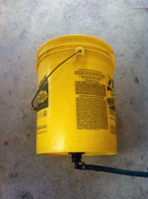 Sandell drops the hot corn on the cob into one of the two 5-gal. plastic buckets, which he modified with sprayer tank fittings in the bottom. With the fitting straddled between 4-in. high blocking and connected to a garden hose, he fills the bucket with water.