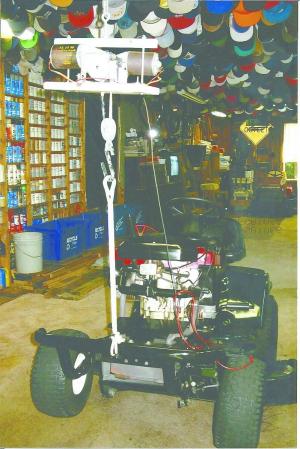 Krentz powers the winch with alligator clamps that attach to the battery in the mower. “When I want to lower the mower, I just reverse polarity on the clamps and hit the switch,” says Krentz.