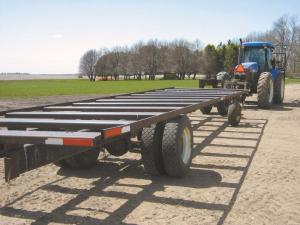 With the stabilizers in place and the pedestal front end, Ackermann can carry twenty-four 1,000-lb. bales at a time out of the field. He stacks them 3 wide and 2 high on the 38-ft. long bed.