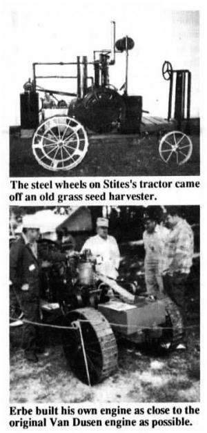 Cledus Stites, Odon, Ind.: He used old photos to build his half-size Froelich. The tractor is powered by a 1-cyl. Fairbanks-Morse upright engine that's cooled by a water tank on back. A belt driven pump circulates water through the engine. The main 15-gal. gas tank is located behind the driver, with a 2-gal. reserve tank mounted on top of the tractor. The transmission has three forward gears and one reverse. Stites turns the flywheel to start the tractor, then puts the transmission in gear and hops onto the wooden operator's platform where he pulls a lever (mounted on a pedestal next to the steering wheel) to tighten a belt. The steel wheels came off an old grass seed harvester. Each rear drive wheel is direct-driven by the transmission. A lever is used to operate the brakes. Contact: FARM SHOW Followup, Cledus W. Stites, Rt. 1, Odon, Ind. 47562 (ph 812 636-4189).