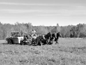 Power forecarts make it feasible to run a successful farming operation with horses, but the driver needs to earn each horse’s trust before he can start up a noisy diesel engine for the horse to pull. Because of that, Julian is a fan of the Brabant crosses because of their gentle disposition. He shares his knowledge and practices through media such as Rural Heritage magazine. The website, www.ruralheritage.com, includes videos of him farming with his horses.