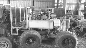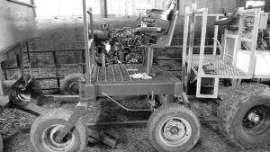 The second forecart has a 115 hp, 3.9-liter turbocharged, inner-cooled Cummins diesel engine, mounted on 1-ton Ford truck axles butt-welded together.