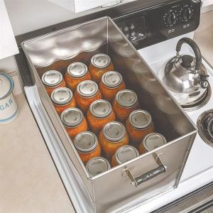 With its simple box design and no drains or valves to wear down, it simply lasts and lasts. The canner has an extra strong top edge wrapped around a 1/4-in. bar of solid stainless steel. Wooden handgrips make it easy to handle.