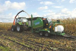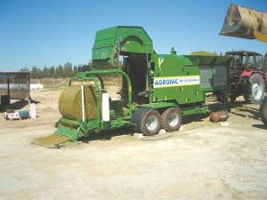 The Agronic silage baler can be towed through the field with a forage harvester blowing silage into the hopper, compressing and then dropping wrapped bales out the back. It can also be operated while stationary, feeding silage into the hopper from a silo or wagon.