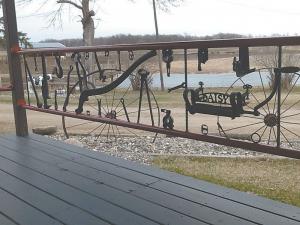 Altogether he made 10 7-ft. sections of railing. Eight have the wrenches along with a few other old tools and even jacks and a pump handle. The other two are farm scenes he welded together. He finished it off with cow stall dividers for railings along the steps.