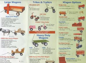Trikes start at $150 for the child-size, with adult trikes priced at $225. Wagons range from $80 for the coaster wagons to $510 for the 34-in. wide, 60-in. long, Big Oak twin-seat wagon for miniature horses.