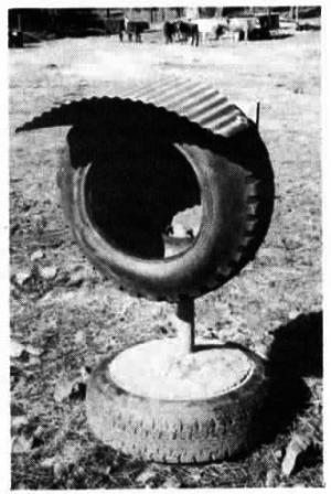 Zenz says using tires makes the feeder more durable than most feeders on the market. To build it he filled the bottom tire with concrete, sticking a 1 1/2-in. dia. galvanized pipe down into the center of it. Then he bolted a piece of plywood to the back side of an extra-wide pickup tire and attached it to the galvanized pipe with U-bolts so height can be easily adjusted. Two 8-in. long 2 by 6-in. spacers are fitted to either side of the tire to spread it out for easy access. A piece of tin is bolted to the top of the tire to keep rain out.