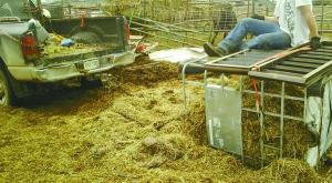 “We had to clean out the old hay from our hay yard before we could stack new hay in there, in order to help prevent mold,” says Campbell. “We turned the tote cage on its side and weighted it down, then hooked a chain on and dragged the tote behind our pickup to fill it with hay. We dragged the tote out to our pasture and unloaded it for the animals to sort through and sleep on, and then we dragged it back again for another load.