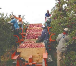 The brothers spent many hours tending trees and picking apples as kids. They earned engineering degrees in college, then eventually came back to the family business with the idea to design a machine to simplify their work. They collaborated with Cornell University over the years to perfect the Picking Platform. The design allows 8 workers to pick and fill 5 bins at a time. Three of the 5 bins rest on a sloping platform and 2 more are just above ground level. Four workers stand on platforms at two different levels on either side of the bins and pick fruit in sacks. When their sack is full, they turn about 180 degrees and place the fruit into the “V” at the bottom of their bin. When the bins are full, they’re replaced by 5 empty bins from a nearby trailer, which takes only about 5 minutes.