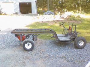 He mounted a 16 hp Honda-clone engine at the rear of the frame. Power is delivered to the transaxle via a torque converter system common to snowmobiles with a clutch and drive pulley.