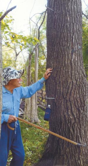 One day when my pasture renter was checking on his cattle, he found someone who had just finished up ruining a 20-ft. tall, 21-in. dia. walnut tree. He made a deer stand in the tree and screwed 11 metal climbing steps onto the trunk.