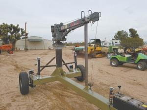 He started with an old Venturo truck-mounted crane that he bought at an auction. “The crane was decommissioned from service because it had been welded on, and the insurance carrier wouldn’t certify it,” says Carlson. “The axle and hitch came from a trailer that had been destroyed, and all the gusset material I used came from scrap metal I already had. I welded a 42-in. long piece onto a 10-ft. length of 7-in. square tubing, and cut a mounting plate for the crane out of an old pickup bed-mounted, fifth wheel plate. I also mounted a Group Size 4D battery on front of the crane’s tongue to offset the weight of the crane on back. I used 5,000-lb. bulldog trailer jacks to fabricate a couple of removable stabilizer legs.”