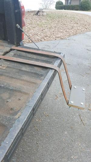 He simply took two pieces of 2-in. wide 1/4-in. strap metal and bolted a piece of scrap lumber to it with 4 bolts. He bent the straps to fit over the tailgate so all he has to do is pull the step to the back of the truck and slip it on.