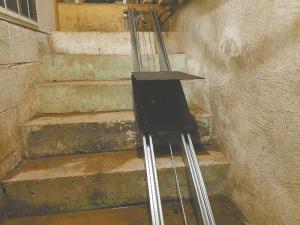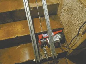 He mounted a switch for the hoist on the wall near the bottom of the stairs. The rails are offset to one side, leaving room for the stairs to be used normally.