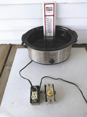 She plugs the crockpot into an outlet that’s wired in series to a dimmer switch that controls the current to the 110-volt wall outlet. It lets her lower the crockpot temperature to just a few degrees above freezing.