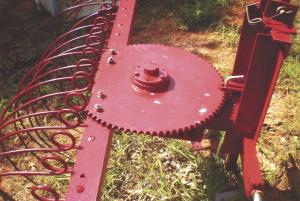 The rake originally came with wheels but someone had removed them. Fisher used heavy angle iron to build a 3-pt. hitch, which extends back to the rake’s angle iron frame and bolts on using existing holes. He cut off part of a 2-ft. dia. sprocket to “square it up” with the frame and then bolted it on. The sprocket swivels on a vertical shaft with bearings, and is held in place by a short metal pin that fits between the sprocket teeth.