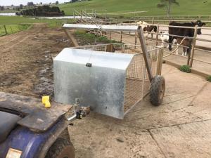 The wheels attach to a U-shaped frame that rises up over the trailer. For transport, the winch pulls down on the frame, raising the trailer to normal height. By letting out cable with the winch, the frame moves backward, lowering the trailer bed to the ground for easy loading.