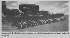 At first glance, the new Briggs seeder looks like a conventional air seeder with a large 160 bu. grain tank and folding wings behind. But instead of blowing seed out to individual rows with air, the new drill uses augers to carry the seed. A pair of small augers carries seed from the tank to a shallow hopper at the rear. There, 2¢-in. dia. cross augers carry seed along the length of the drill, filling the hopper until pressure plates at the ends of the wings switch the augers off. Seed is metered out of the hopper by conventional metering wheels to seed tubes which place seed behind conventional hoe drill shovels.