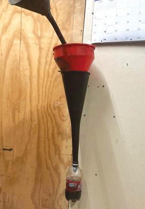 Tom Chaney, Chrisman, Ill.: “I didn’t like wall-mounted oil funnels dripping oil down my shop wall and making a mess, so I shoved the neck of an empty plastic soda bottle up onto the bottom end of a transmission oil funnel. I place my other funnels inside the top of the transmission oil funnel, so any oil that drips out of them will run down into the bottle. Once the bottle is full I just pull it off and empty it out.”
