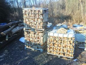 “I load the wood directly from my wood processor into the totes,” says Petrevich. “Once a tote is full, I use my Kioti 75 hp. 4-WD loader tractor to haul the cages to a storage area and stack the cages 2 or 3 high. I place a lid on the top cage to keep rain and snow off the wood. The wood gets plenty of airflow and sunlight.”