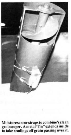 Developed by DMC , the Calc-U-Dri's stainless steel sensor simply mounts neat the top of the combine's clean grain auger. It consists of a metal "fin" that extends into the auger. As grain is augered past the sensor, it reads moisture using electrical resistance and sends a reading to a control box in the cab, which can be set to give an audio or visual alarm when moisture reaches a preset limit.