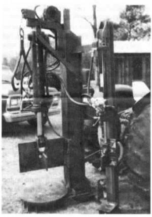The big splitter has a 4-way blade and a rotary turntable. It lets me cut up big chunks into smaller pieces that I can then cut up even smaller with the smaller splitter. Both splitters and the winch are powered by a ptodriven hydraulic pump. The splitters mount on I-beam masts. The splitting wedges are fitted to brackets that slide up and down one side of each beam.This set up lets me drive right up to the tree and cut the wood up into any size I want. I built everything in my shop. (Clyde E. Williams, Rt. 1, Box 199, Leakesville, Miss. 39451 ph 601989-2426)