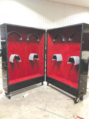 He also designs and builds strong and lightweight clam-shell style wheeled aluminum tack boxes and harness carts. JW Show boxes keep supplies on a handy rolling cart, traveling securely latched together and opening to reveal custom interior finishes and special lighting that provides a beautiful display for the harnesses.