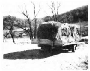 Homemade Bale Hauling Trailer HAY & FORAGE HARVESTING Bale Handling (5) 19-4-34 It doesn't take a lot of money to make a bale hauling trailer. We built this one for a total cost of $142, plus our labor. It'll haul 3 big round bales, or 8 smaller round bales with four on each side. It consists of an axle from an old Ford combine that we fitted with smaller 14-in. rims. We bought the steel frame at an auction for $17. We fished some railroad ties out of the river during high water in the spring and sawed our own 6 by 6 stringers and 2 by 6 boards for the deck at our sawmill. Deck boards are spaced 1 1/2 in. apart. We bolted a 2 by 4 along each edge to tip the bales slightly inward as we have hilly land. A pair of 3 by 3-in. end stakes with two 2 by 6 boards keep bales from rolling off the back. The trailer bed is 18 ft. long, 8 ft. wide. (Grau Brothers, P.O. Box 251, Brownsville, MN 55919)