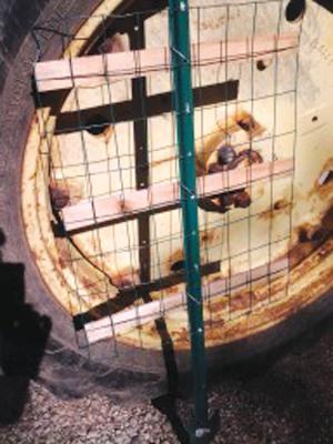 Bunniss’ solution involved a 4-ft. steel fence post, a 4-ft. piece of wood lath cut into three equal pieces, and a 16-in. section of 2 by 4-in. wire fencing. Everything is held together by twisting wire around the laths and post, then stapling the fencing to the ends of the laths.