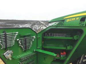 The combine model also holds both 3/8-in. and 1/2-in. sockets, while the tractor has only 1/2-in. sockets. The entire combine unit swings out and away for access to the rotor behind it. The tractor model mounts directly to the frame for easy hood access. Both hold metric and standard sockets and wrenches, as well as a variety of other tools and maintenance supplies.